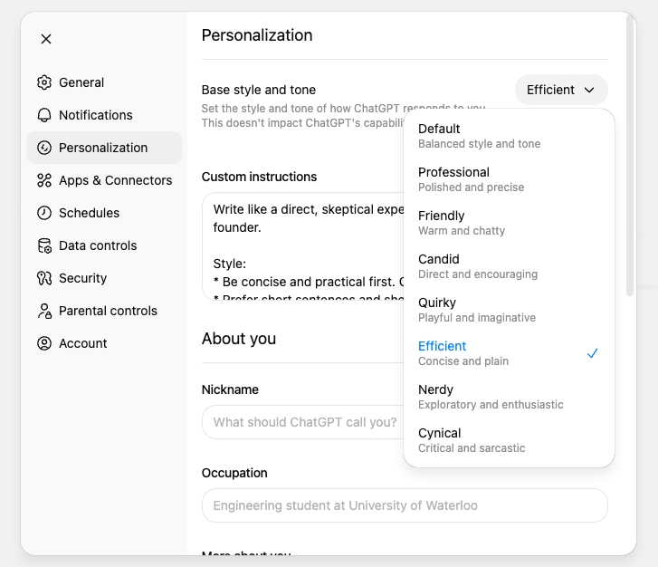 - Personality presets: Default, Friendly, Efficient, Professional, Candid, Quirky, Cynical, and Nerdy.
